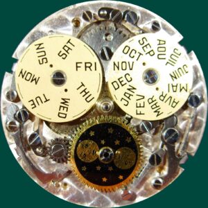 At first glance, the calendar seems German (“Mon” for Montag -> Monday, “Mai” for May), but “Mai” is also French. So we have a bilingual calendar — English for the day, French for the month — possibly a special-order detail requested by the original owner.